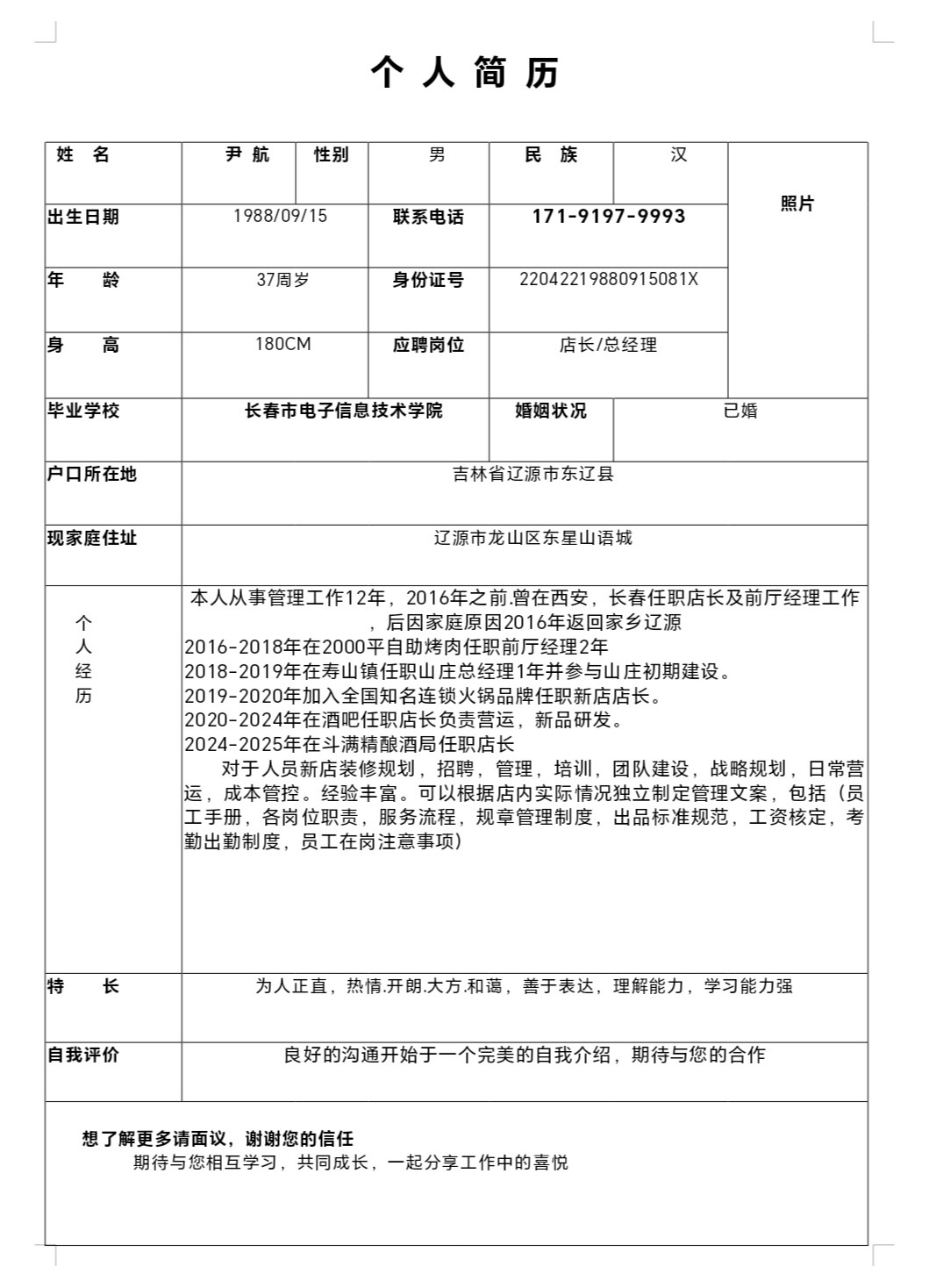 本人從事管理工作12年,2016年之前.曾在西安,長(zhǎng)春任職店長(zhǎng)及前廳經(jīng)理工作,后因家庭原因2016年返回家鄉(xiāng)遼源